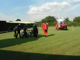While the injured victim was being stabilised, the pilot of the aircraft had time to take a few photos of the bowlers in front of the helicopter on the green.